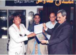 الأستاذة/ عزة سليمان مدير عام المؤسسة تسلم الدرع الي سيادة المحافظ